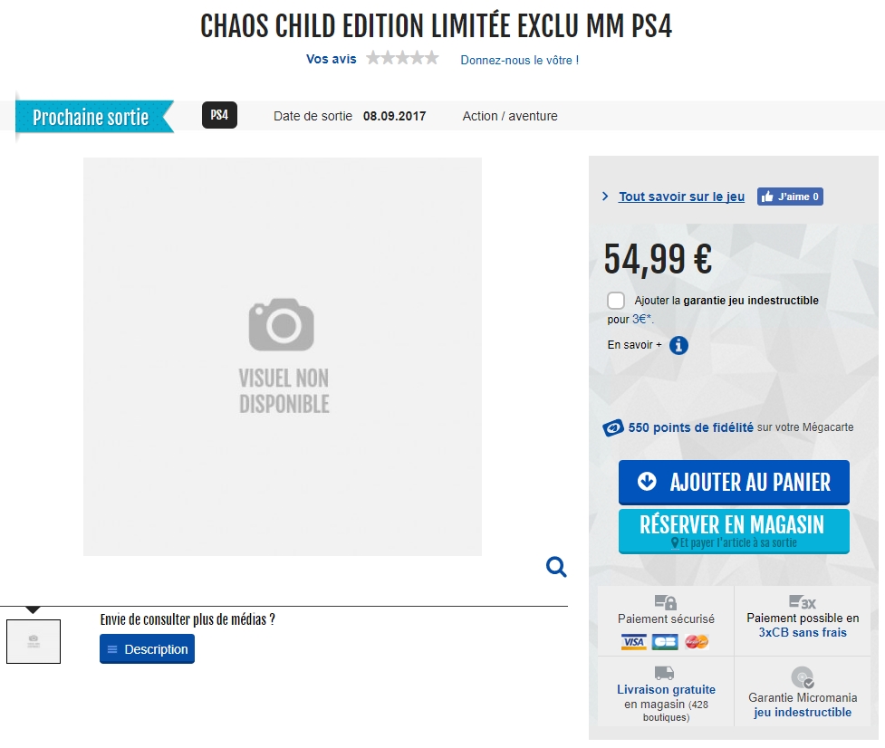 D’après le site de Micromania, cette édition limitée exclusive de Chaos Child serait disponible le 8 septembre 2017 au prix de 44,99€ sur PlayStation Vita ou 54,99€ sur PlayStation 4.
