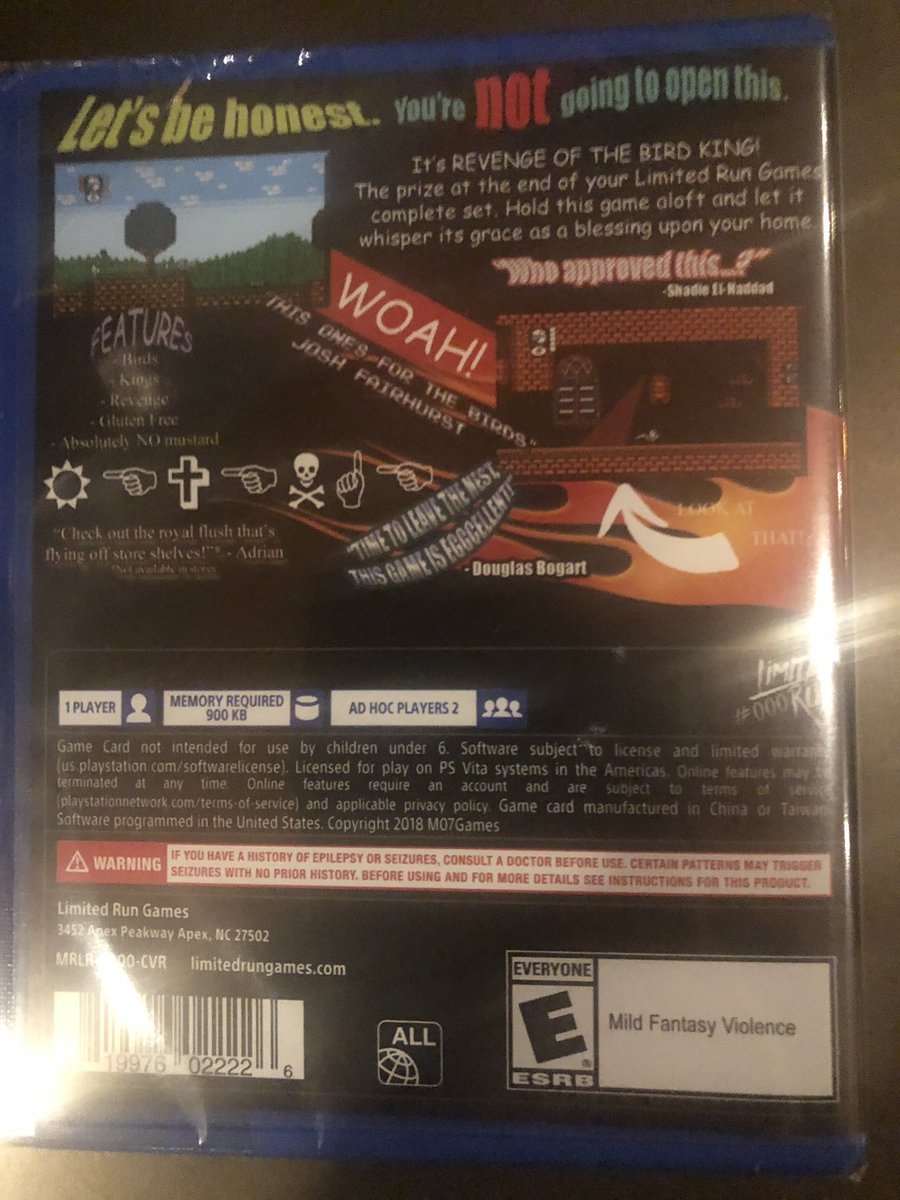 Revenge of the Bird King ne devrait pas pouvoir être acheté sur le site de l’éditeur puisque comme indiqué sur l’arrière de la jaquette il s’agit du jeu Limited Run #000 et qu’il est écrit :