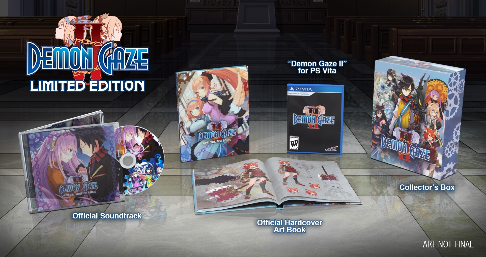 La dernière localisation annoncée par NIS America est Demon Gaze 2 qui arrivera dès cet automne sur PlayStation Vita avec un portage sur PlayStation 4 en Amérique du Nord dans les deux formats possibles que sont le format physique et le format dématérialisé, ainsi que l’Europe où une version physique n’a pas été encore annoncée. De plus une autre édition collector sera disponible sur PS Vita et PS4 contenant :