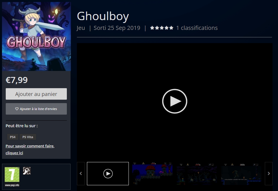 A noter qu’une seconde version de Ghoulboy est apparue le 25 septembre 2019 sur le PS Store. Cette nouvelle version est classifiée PEGI 7 au lieu de 12 et n’inclurait pas de thème PS4.