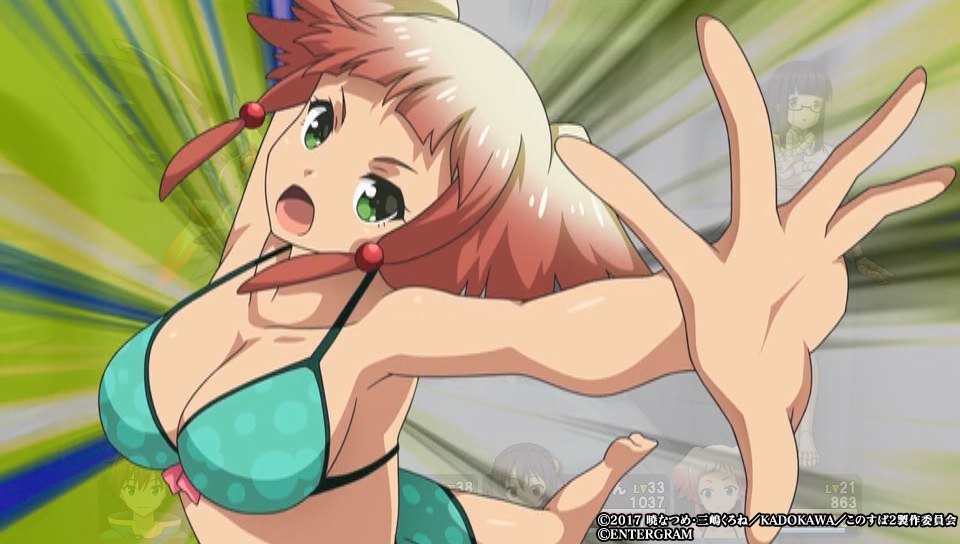 Entergram en finit également avec l’époque du DRPG austère graphiquement. Si des titres comme Mary Skelter Nightmares sont parvenus à moderniser le genre du point de vue de la présentation, cette adaptation de Konosuba va encore plus loin par l’introduction de séquences animées dans les affrontements. Concrètement, chacun des neuf personnages jouables possèdent deux ou trois capacités qui donnent lieux à une petite animation très drôle. Voir Megumin balancer son speech chûnibyô en plein milieu d’un combat de boss ultra-tendu est à hurler de rire! Cerise sur le gâteau, les boss en disposent aussi.