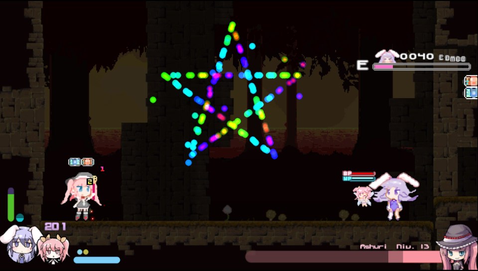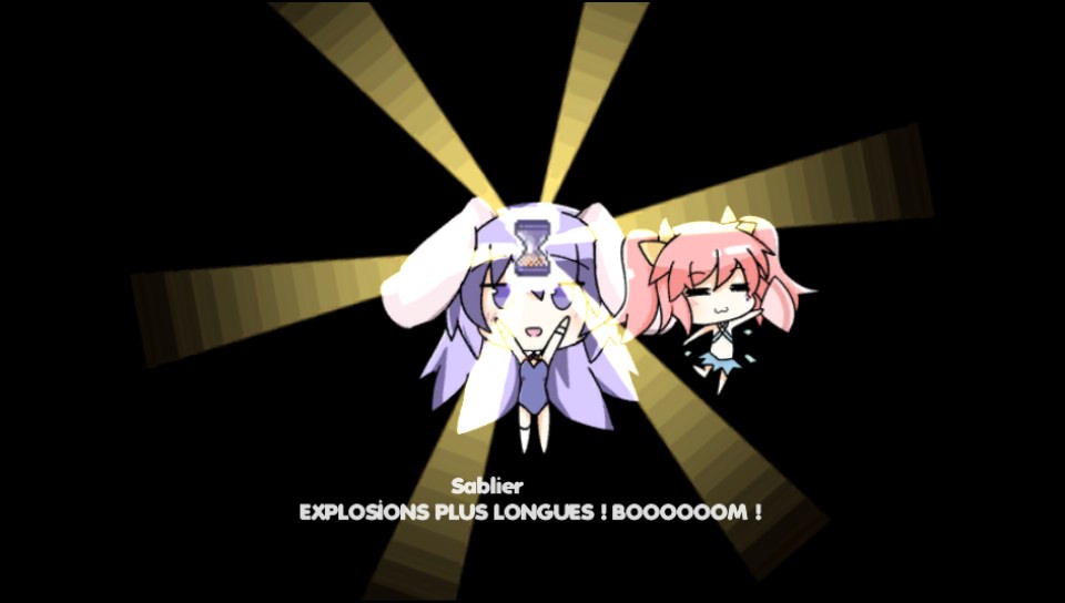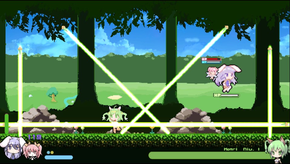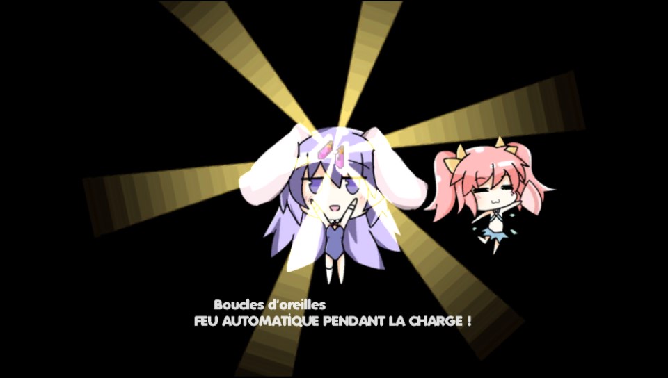 Alors attention le côté shoot them up n’est pas du niveau de certains jeux, comme ceux de CAVE par exemple. Loin de là, car si dans Rabi-Ribi la plupart des ennemis vous tirent dessus plutôt gentiment, la plus grosse partie shoot them up se situe en fait au niveau des boss, qui ne vous attaqueront pas avec de simples petites boulettes comme certains ennemis croisés durant les escapades de nos deux héroïnes, mais plutôt avec des attaques de plusieurs dizaines de boulettes qui peuvent vous suivre, ou encore avec des attaques de multiples lasers. Des attaques qui, comme dans les shmups, laissent peu de place pour les esquives !
