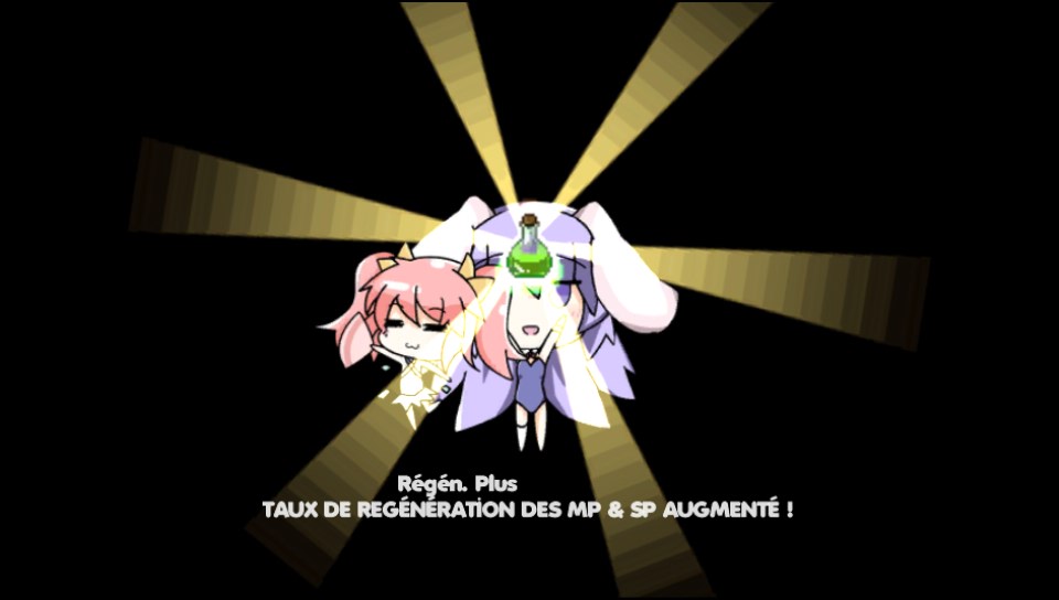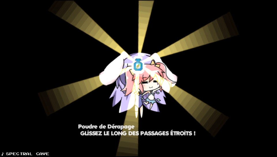 Si je vous ai précédemment parlé de quêtes, c’est parce qu’en plus de de mélanger le genre pateforme et shoot them up, Rabi Ribi intègre une légère dose de RPG, avec de l’équipement et des bonus de stats qu’il est possible d’acquérir en parcourant les environnements du jeu, pour booster la puissance des attaques, réduire les dégâts subits, acquérir de nouvelles attaques ou encore augmenter la hauteur des sauts pour accéder à certains passages trop élevés en début de jeu. Ces aptitudes sont à améliorer plusieurs fois pour qu’Erina puisse sauter de plus en plus haut et ainsi découvrir de nouveaux environnements pour pouvoir avancer dans l’histoire. Certains de ces bonus permettent aussi de modifier le type des tirs de Ribbon.